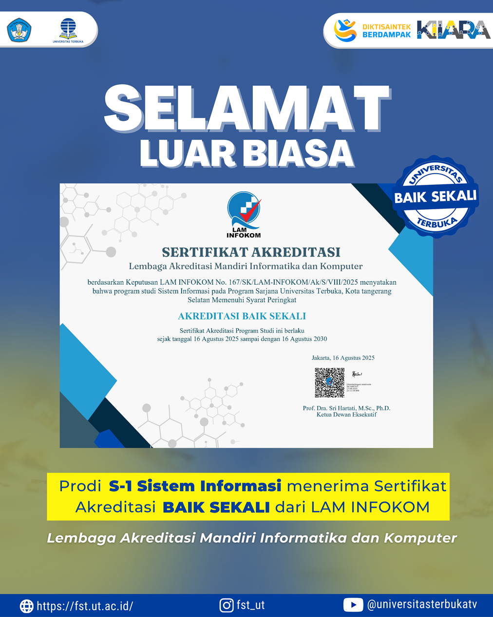 Fakultas Sains dan Teknologi Universitas Terbuka mengucapkan Selamat kepada Program Studi S-1 Sistem Informasi yang telah berhasil meraih Akreditasi Baik Sekali dari Lembaga Akreditasi Mandiri Informatika dan Komputer (LAM INFOKOM) berdasarkan SK No. 167/SK/LAM-INFOKOM/Ak/S/VIII/2025.