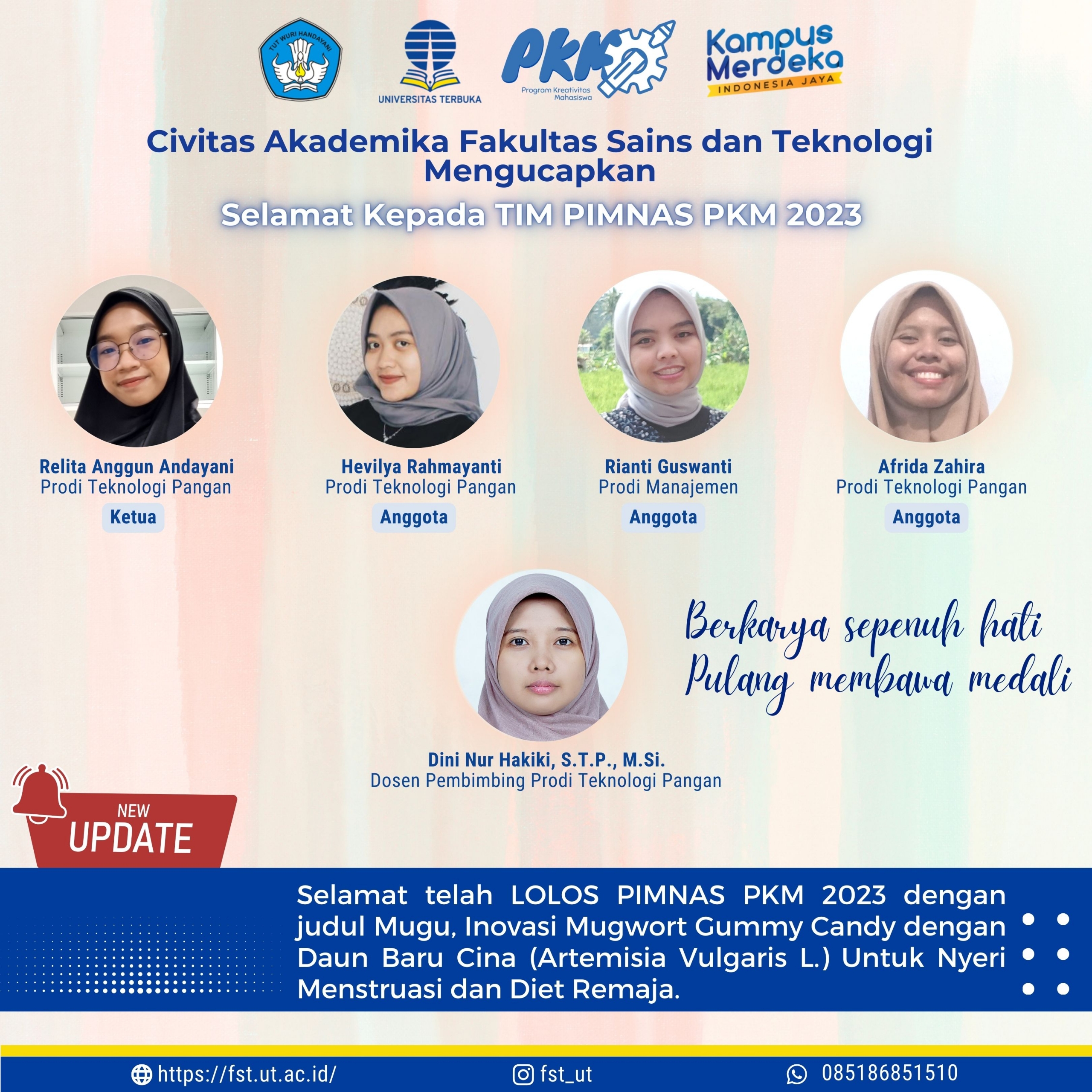 Civitas Akademika Fakultas Sains dan Teknologi mengucapkan Selamat telah LOLOS PIMNAS PKM 2023 dengan judul Mugu, Inovasi Mugwort Gummy Candy dengan Daun Baru Cina (Artemisia Vulgaris L.) Untuk Nyeri Menstruasi dan Diet Remaja.
