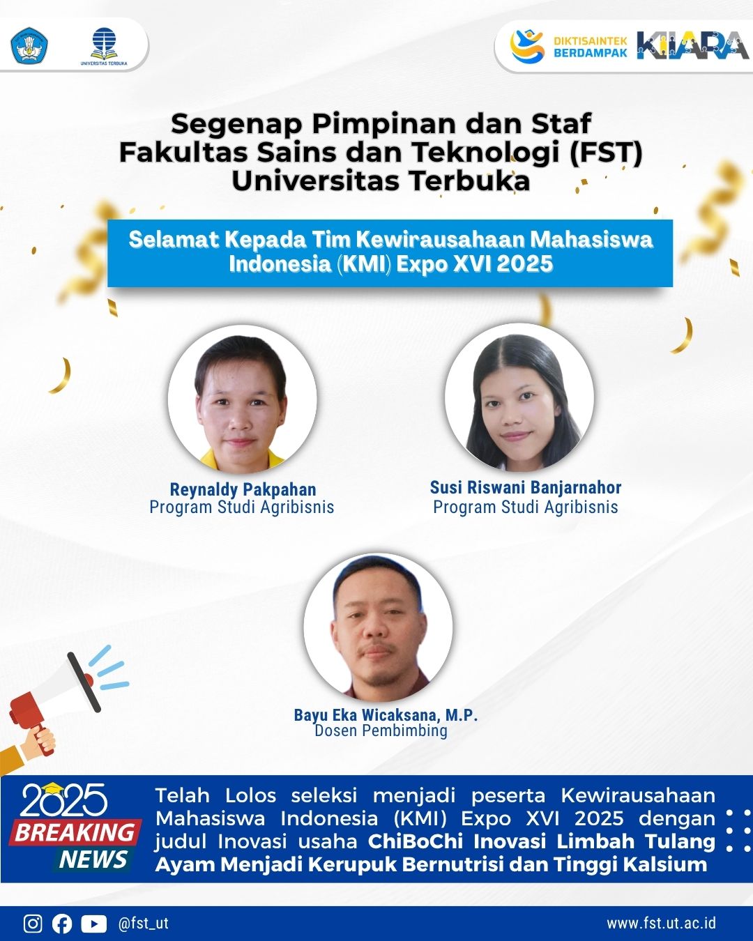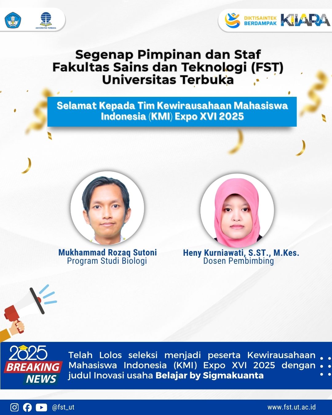 Fakultas Sains dan Teknologi Universitas Terbuka (FST UT) mengucapkan selamat dan sukses kepada dua tim mahasiswa yang telah lolos seleksi menjadi peserta Kewirausahaan Mahasiswa Indonesia (KMI) Expo XVI Tahun 2025 yang diselenggarakan oleh Direktorat Pembelajaran dan Kemahasiswaan (Belmawa) – Ditjen Diktiristek.