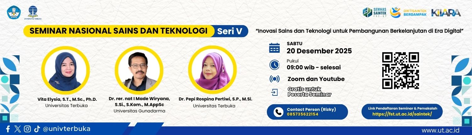 Seminar Sains dan Teknologi (SAINTEK) merupakan forum ilmiah tahunan yang diselenggarakan oleh Fakultas Sains dan Teknologi Universitas Terbuka. Kegiatan ini bertujuan untuk mendorong pertukaran ilmu pengetahuan, hasil penelitian, dan inovasi di bidang sains dan teknologi, baik dari kalangan akademisi, peneliti, praktisi, maupun mahasiswa. Seminar ini juga menjadi sarana kolaborasi dan pengembangan keilmuan yang relevan dengan kebutuhan era digital dan pembelajaran jarak jauh.